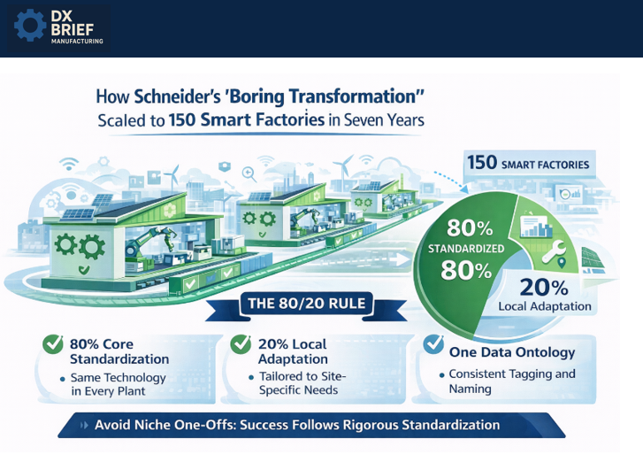 The 80/20 rule is why Schneider scaled, and why most transformations don't. Schneider's smart factory program succeeded because they enforced ruthless standardization: 80% of technology, use cases, and operating practices are identical across all 150 facilities. Only 20% is customized for location-specific needs.